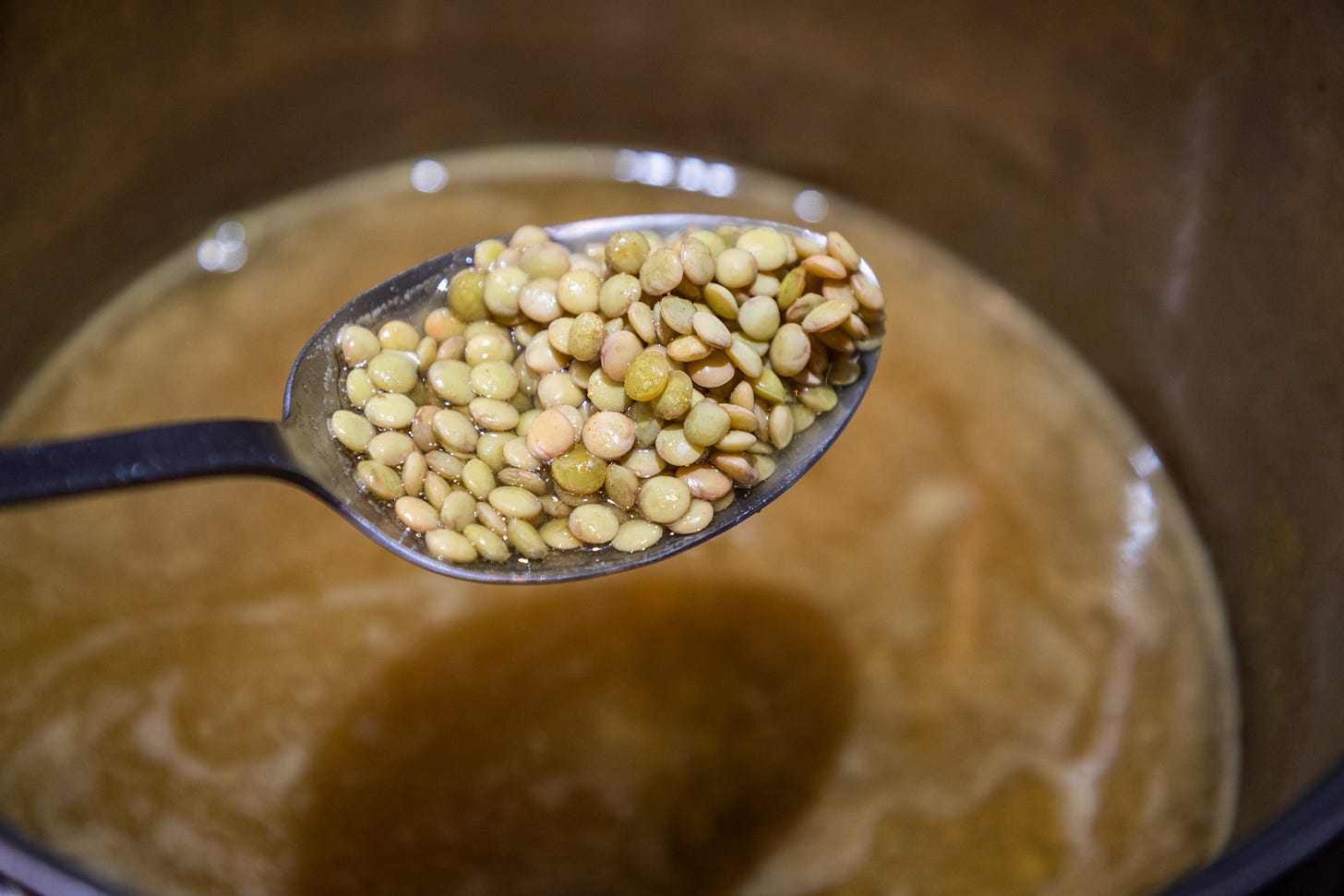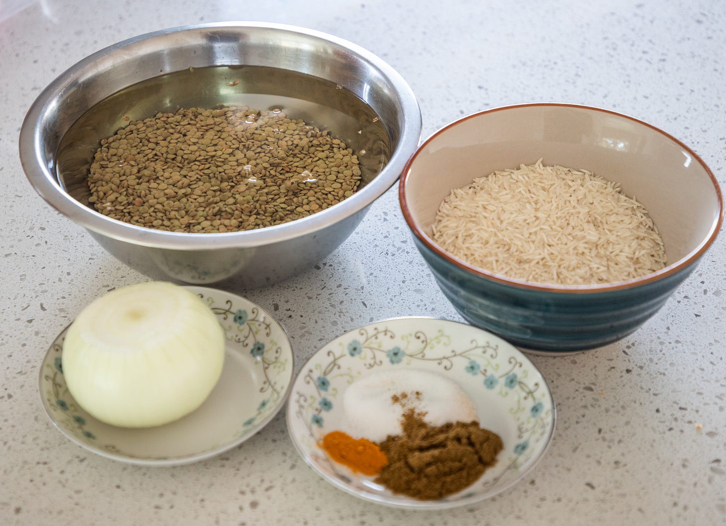 Caramelizing the onions will take about 25 min, but with the water tip, i can move on to do something else instead of watching the onions.Rinse the lentils and add them to a pot with three cups of water and the spices. Cook them for 20 seconds, make sure the lentils are soft before adding the rice.