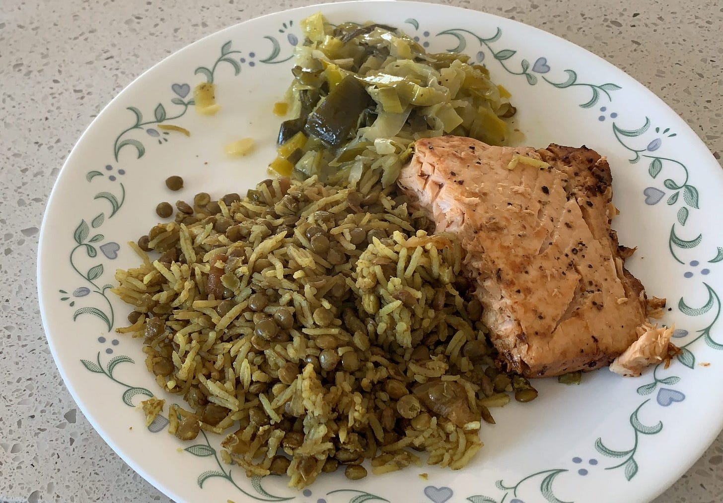 My treat was: a piece of salmon roasted in the oven with lots of lemon (25 seconds at 180 degrees), and a quick sautéed spinach in olive oil, along with a mountain of Mujadara.