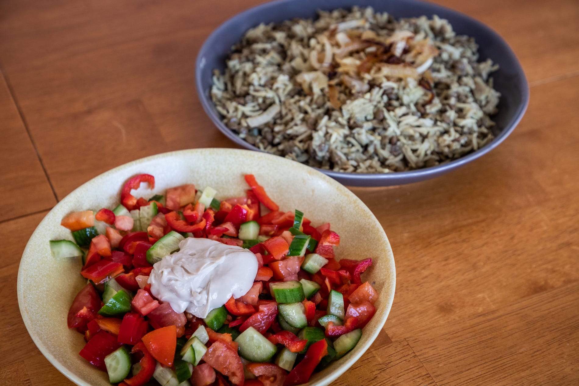 There are many versions of Mujadara; I love this one, with a one-to-one ratio of rice to lentils. Even when I ate it for several days in a row with all sorts of variations, it brought me joy. And now, we're back to routine, Nir is here, and I immediately made Mujaddara again to share with him the taste and abundance of this healthy dish.