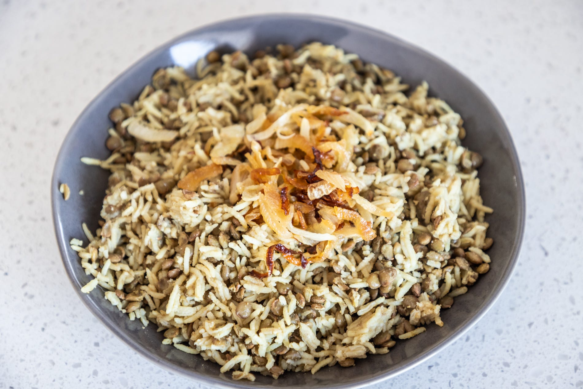 Mujadara is a Middle Eastern lentils and rice recipe with caramelized onions. Just 3 ingredients make a easy vegan, protein-rich meal.