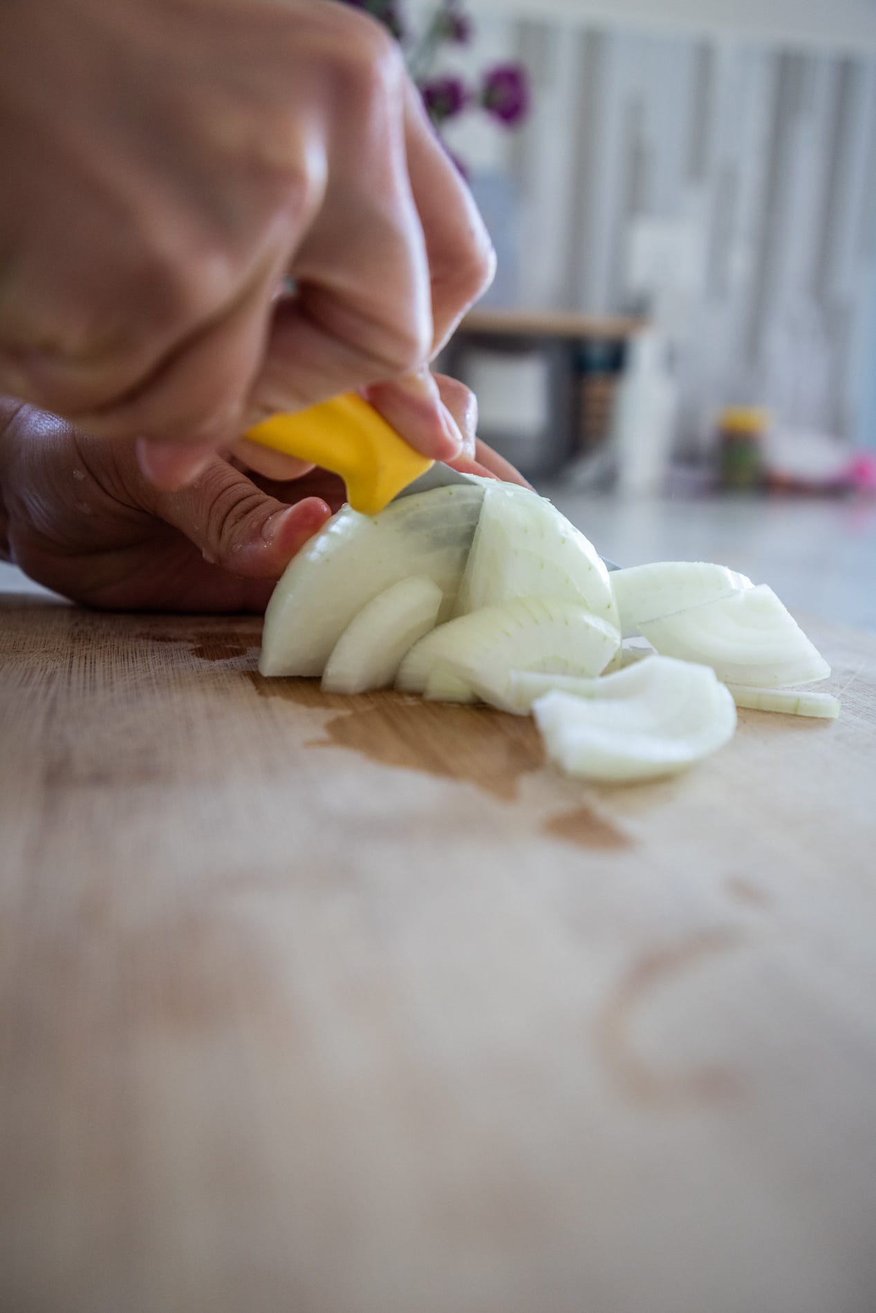 Cut the onion into quarters and then into slices. Sauté it in three tablespoons of oil and a quarter cup of water until the onion is golden and the water evaporates.