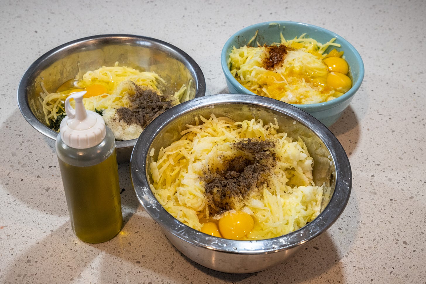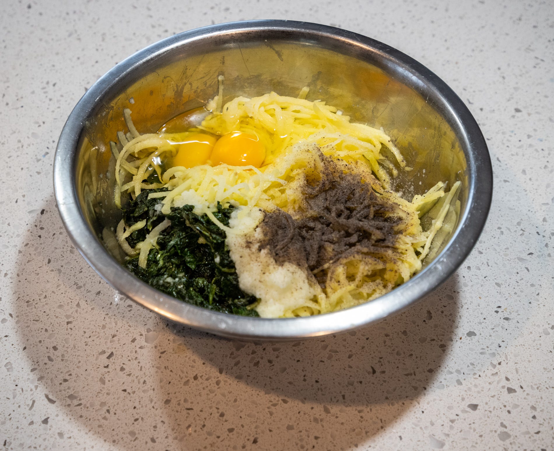 Mix the onion, potatoes and spinach and place in a colander over a bowl, so that they absorb liquids. At this stage you can squeeze a little with your hands so that as much liquid as possible is expelled. However don’t squeeze too much, this will keep the latkes juicy.
