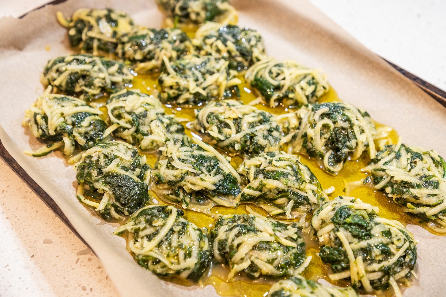 The well know potato latkes getting a twist by additional 500 grams of steamed and chopped spinach. The latkes are baked in the oven for 40 minutes, easy and gilt free. When I am hosting in Hanukkah, I make a double the quantities and divide into seperate bowls, then I am adding a different addition to each bowl - spinach/ sweet potato/pumpkin all works great with latkes. When using the oven you can simultaneously bake a few trays of latkes and make it a festive celebration.